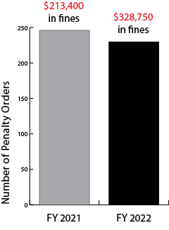 For Fiscal Year 2025, the Commission issued 24 noticed and consent orders in Pipeline Safety dockets. Of those, the Commission approved 23 Pipeline Safety penalty orders assessing $137,250 in fines payable to the state general fund.*